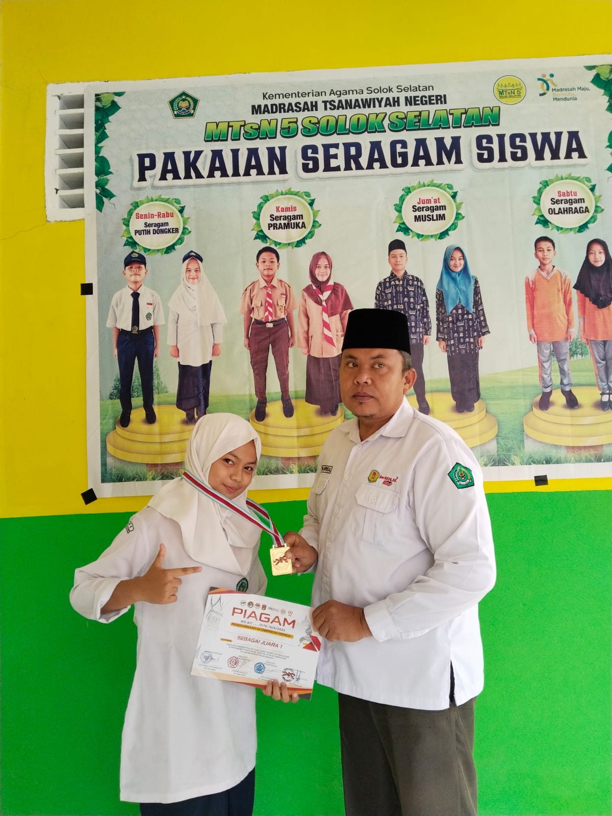 Siswi MTsN 5 Solok Selatan, Ghazia Albisri, menerima piala dan penghargaan sebagai juara 2 dalam Olimpiade Madrasah Indonesia (OMI) tingkat kabupaten Solok Selatan bidang studi IPS. Penghargaan ini diserahkan langsung oleh Kasubag TU Syafra Haradi, S.Ag.M.M.